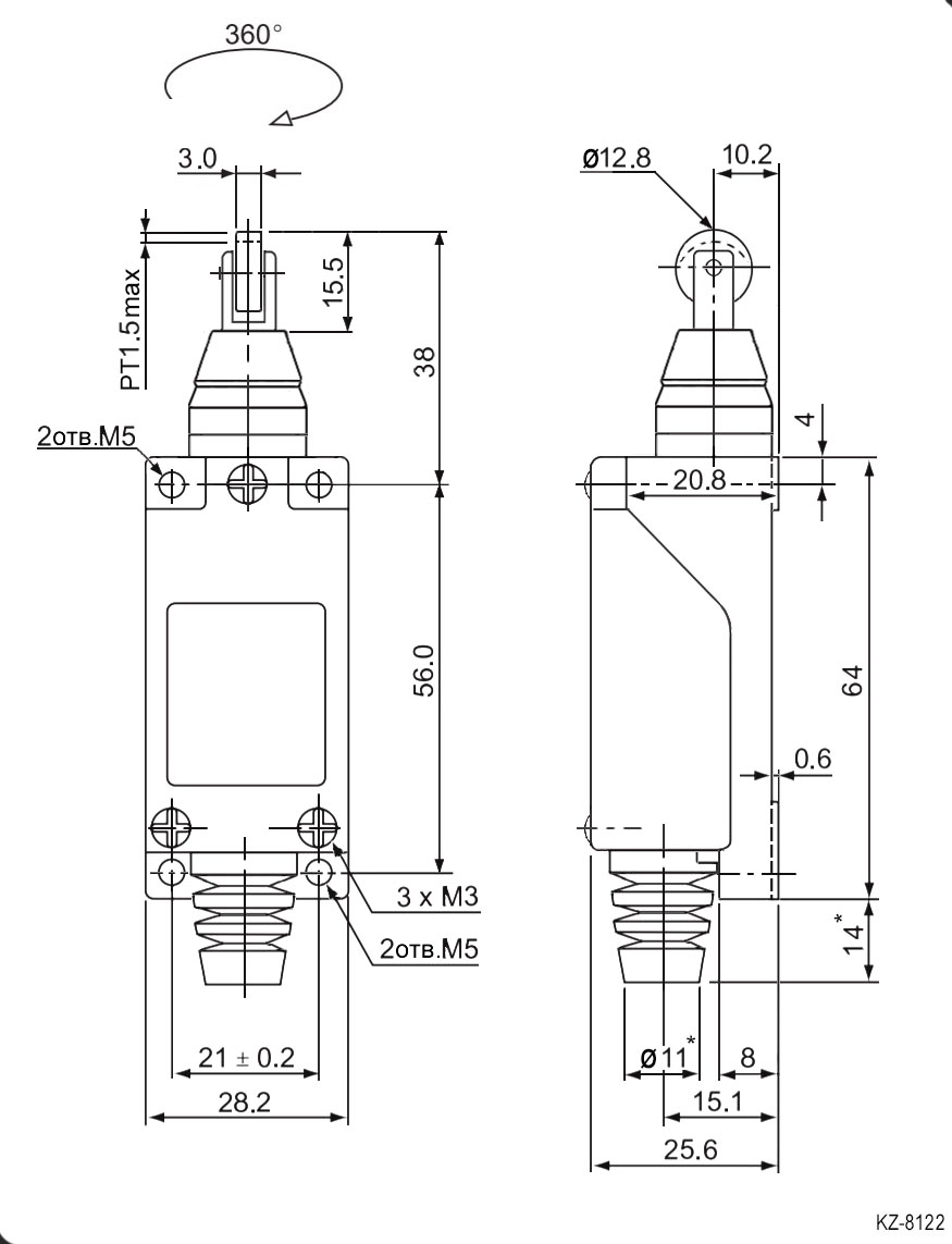 Тип : путевой выключатель с вертикальным нажимным роликом (PTmax=1,5 мм)