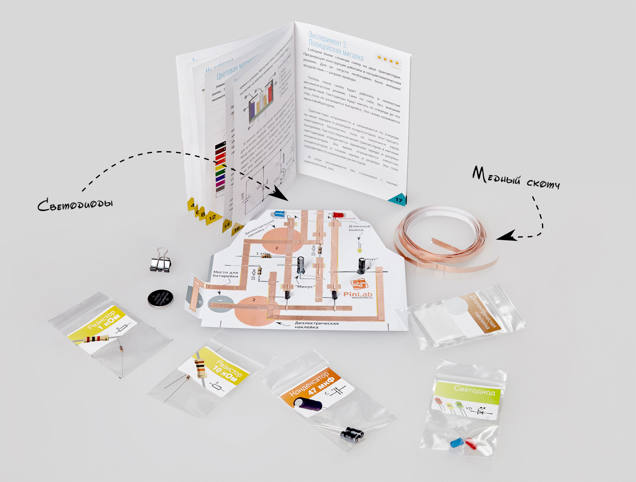 Набор из серии «Электроника на бумаге» поможет юному исследователю узнать о том, что такое электрический ток. Познакомит с электронными компонентами, такими как резистор, транзистор, светодиод и другие.