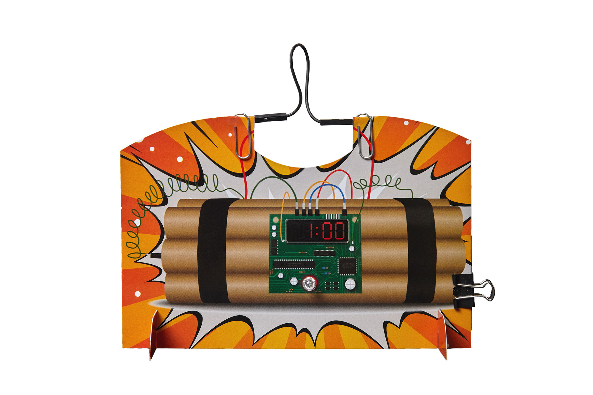 Бомба — Совершенно безопасное устройство, по внешнему виду напоминающее бомбу. Красный мигающий светодиод сигнализирует о наличии электрического питания. При извлечении провода раздается звуковой сигнал. Изучается принцип действия транзистора, зуммера и мигающего светодиода.