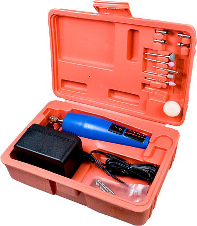 В набор входят: микро дрель (12 Вольт 0,8 Ампер, скорость вращения 12 000 об/мин), 5 стальных сверил, 5 латунных втулок(цанг), 4 точильных камня, пильный диск, держатель инструментальных насадок, блок питания (220В - 12В/1000мА).