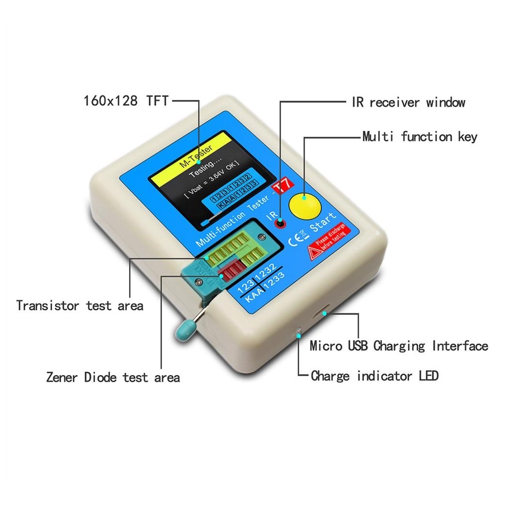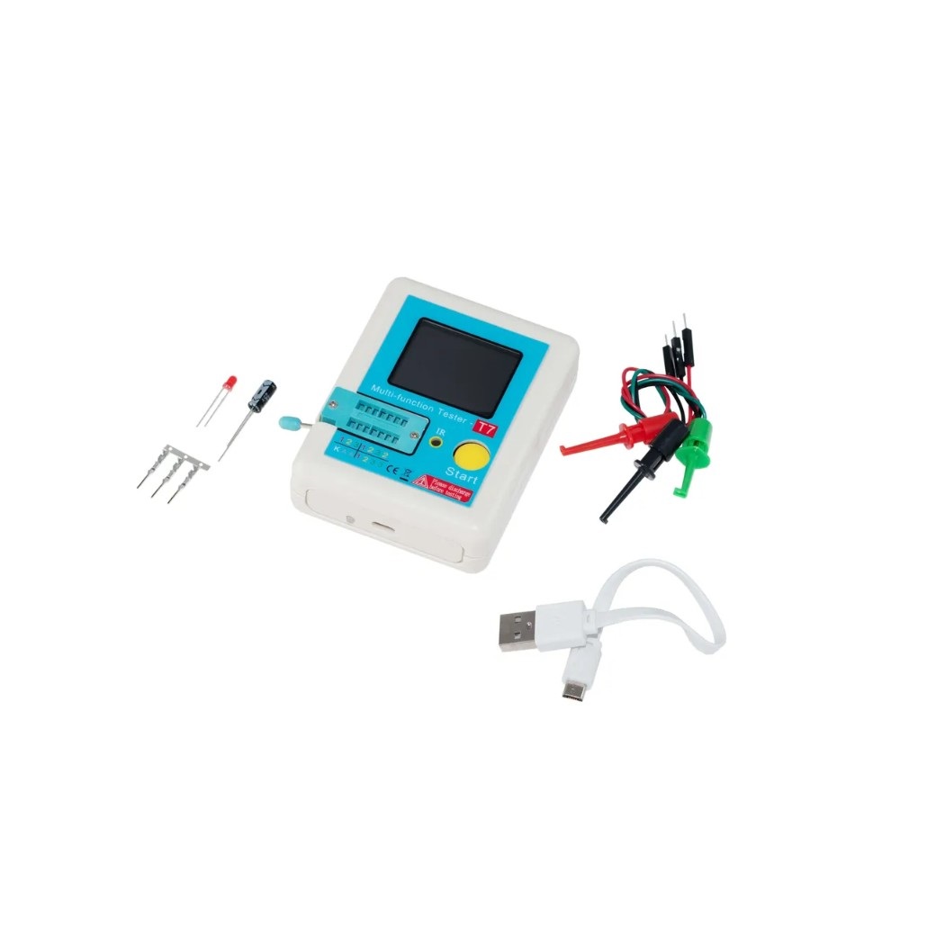 Многофункциональный цифровой тестер LCR-T7 Tester с цветным графическим дисплеем предназначен для идентификации, проверки и измерения параметров элементов питания, резисторов, конденсаторов, катушек индуктивности, диодов, стабилитронов, светодиодов, транзисторов, симисторов и т.п. с последующим выводом их параметров, цоколевки и внутренней организации на графический LCD дисплей.В общем, тестирует и определяет все дискретные полупроводники и пассивные компоненты, имеющие от 2 до 3 ножек.