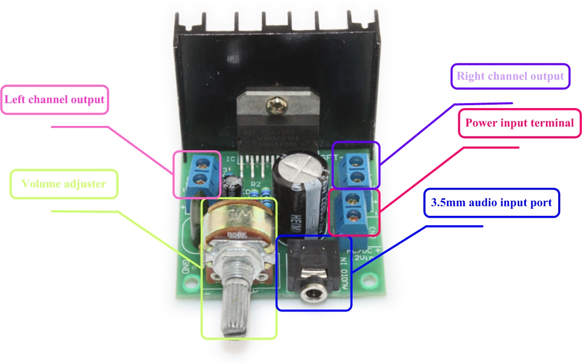 Модуль аудиоусилителя - усилители мощности на базе чипа TDA7266. Модуль имеет входной разъем, два выхода динамиков и разъем питания. Модуль имеет радиатор, который позволяет отводить тепло из системы. Регулировка громкости с помощью потенциометра. Подключение питания сигнализируется загоранием синего светодиода на плате усилителя.