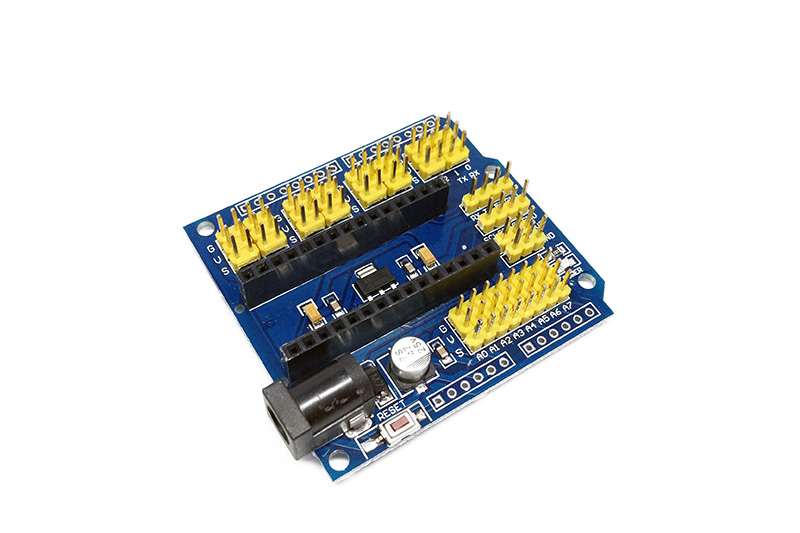 Многофункциональная плата расширения для Arduino Nano. Плата добавляет к пинам дополнительные разъемы под питание и землю, что позволяет подключать одновременно большое количество датчиков, серво-приводов и т.д., силовой разъем для питания, и кнопку Reset. А расположение пинов на плате позводит подключить ее к подходящим для Arduino Uno платам расширения.