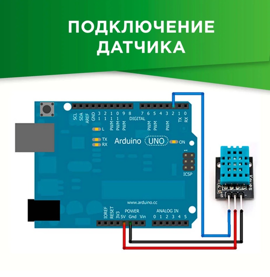 Модуль датчика, можно подключить сразу к Arduino: подключаете VCC к +5В, GND – к земле, третий контакт – к любому свободному пину на плате Arduino. Номер пина нужно будет затем указать скетче. Таким образом можно подключить датчика к разным платам Arduino: Uno, Arduino Mega, Arduino Nano, Pro Mini и другим.