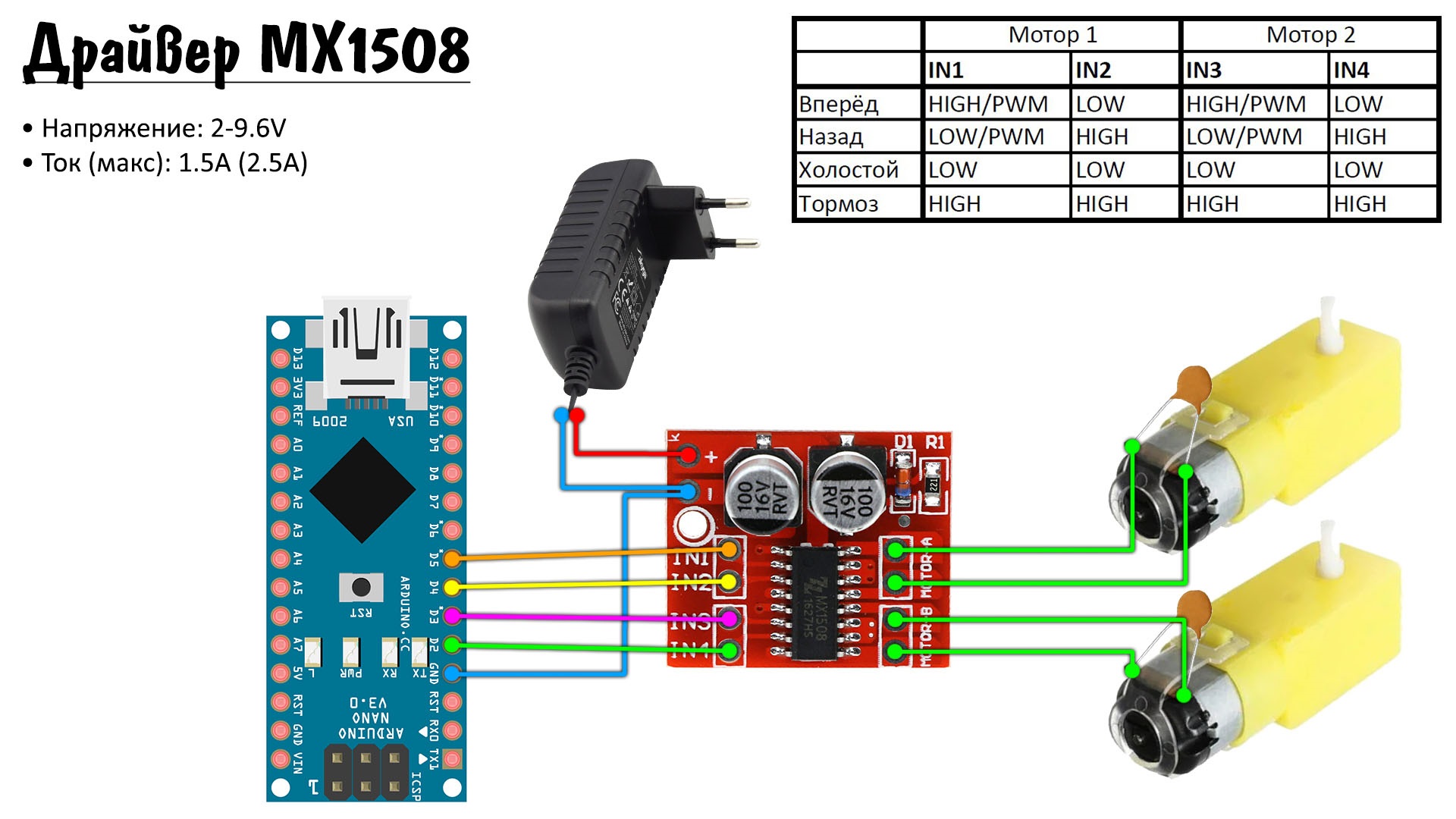 - подключение двух двигателей постоянного тока или одного шагового двигателя;