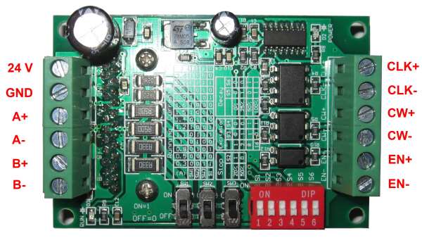 • Обеспечивает стабилизацию фазных токов двигателя на заданном уровне. Максимальный ток фазы до 3 А, устанавливается дискретно переключателями на плате.
