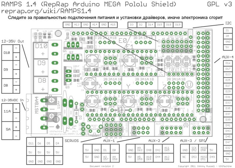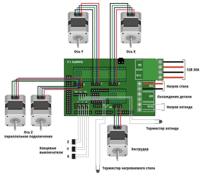 Платформа RAMPS 1.4 (RepRap Mega Pololu Shield) — одна из самых распространённых плат для построения 3D принтеров. RAMPS 1.4 это шилд (надстройка) для Arduino Mega 2560. Ардуино преобразует G-коды в сигналы и управляет 3D принтером посредством силовой части - RAMPS 1.4, плата одевается поверх Arduino и все подключения, кроме USB, осуществляются через неё. Питание 12В, 30A на Arduino подаётся через RAMPS 1.4.