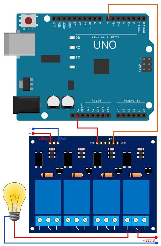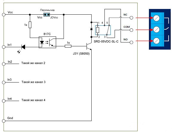 Модуль содержит 4 независимых реле. Каждое реле имеет одну группу контактов на переключение.