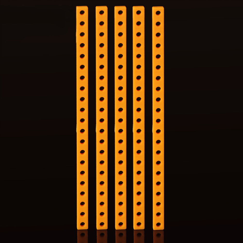 Прочная пластиковая пластина оранжевого цвета с одним рядом отверстий.