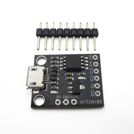 На миниатюрной плате установлен микроконтроллер ATTiny85, разъем MicroUSB, линейный стабилизатор напряжения 5В.