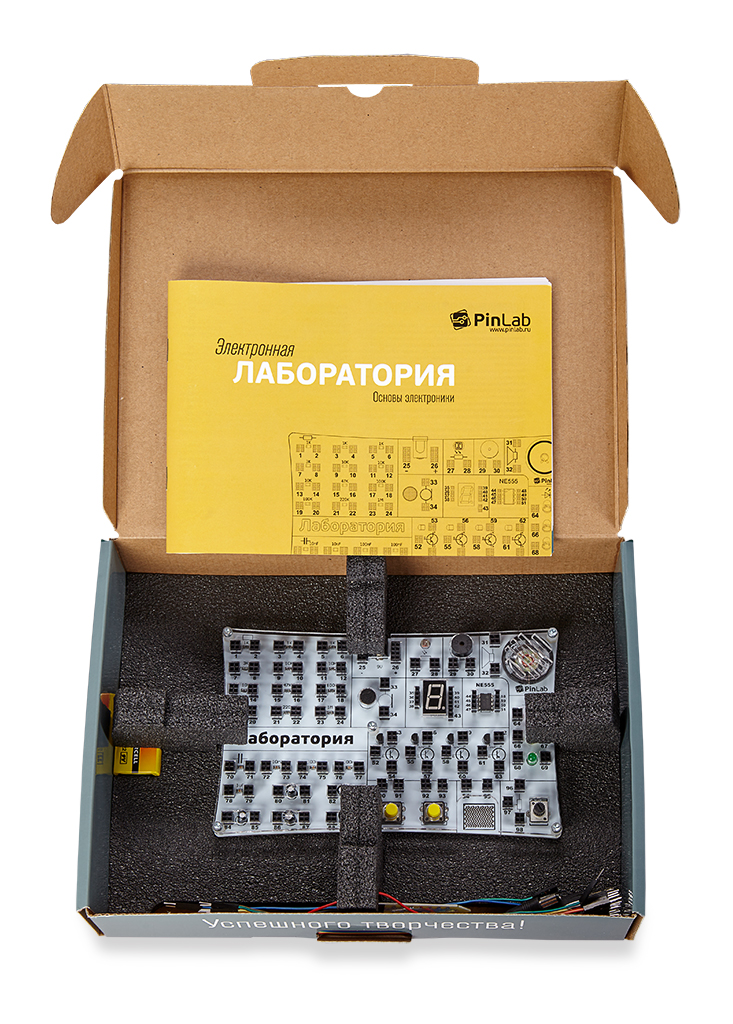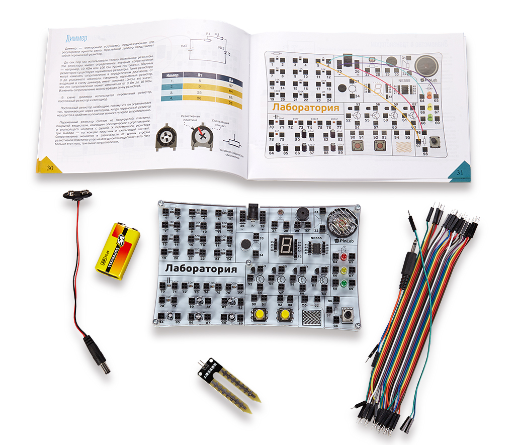 Основа всех конструкций. На плате установлены все электронные компоненты. К выводам электронных компонентов подключены разъемы. Разъемы соединяются между собой с помощью проводов из комплекта набора. Каждый разъем пронумерован. Провода можно вставлять и вынимать сколько угодно раз.