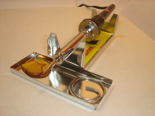 Подставка из белой жести ( железо покрытое оловом ). Благодаря удобной форме занимает минимум места при транспортировке. Но стоит загнуть боковые грани превращается в удобную и устойчивую полностью функциональную с двухсторонней поддержкой подставку для паяльника. Подставка выдерживает даже 200 W паяльники. Благодаря покрытию оловом прямо к подставке можно припаять крокодилы, припой т.е. по месту модернизировать её для наибольшего удобства использования.