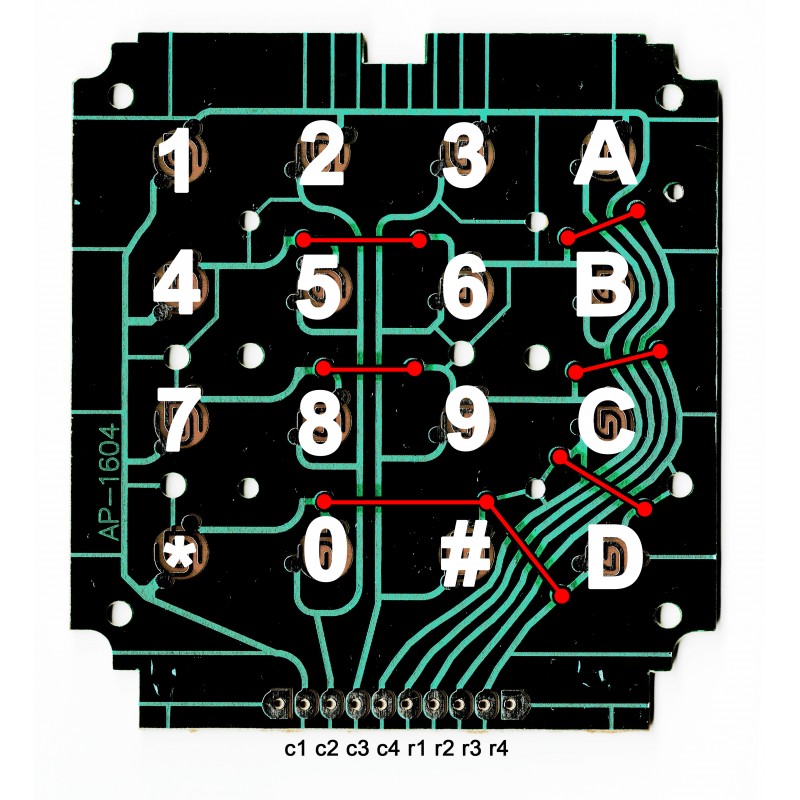 Каждая кнопка, при нажатии на нее, замыкает контакты между конкретным столбцом и конкретным рядом, создавая цепь, которую можно программно обнаружить. Например, если мы нажмем верхнюю левую кнопку на схеме, изображенной выше, мы замкнем контакты c1 и r1. И так, как легко убедиться, любой кнопке соответствует своя индивидуальная пара контактов.