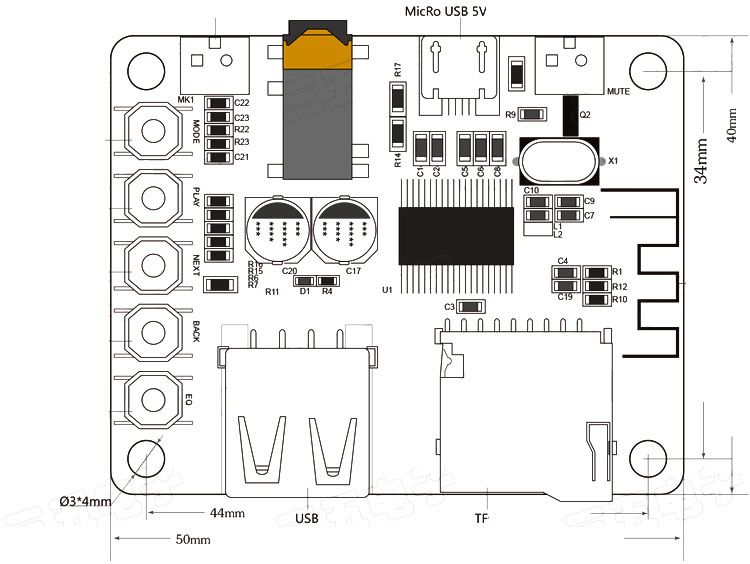 Hасстояние между посадочными отверстиями (М3): 34 мм х 44 мм