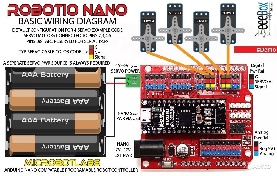 Многофункциональная плата расширения для Arduino Nano. Плата добавляет к пинам дополнительные разъемы под питание и землю, что позволяет подключать одновременно большое количество датчиков, серво-приводов и т.д., силовой разъем для питания, и кнопку Reset. А расположение пинов на плате позводит подключить ее к подходящим для Arduino Uno платам расширения.