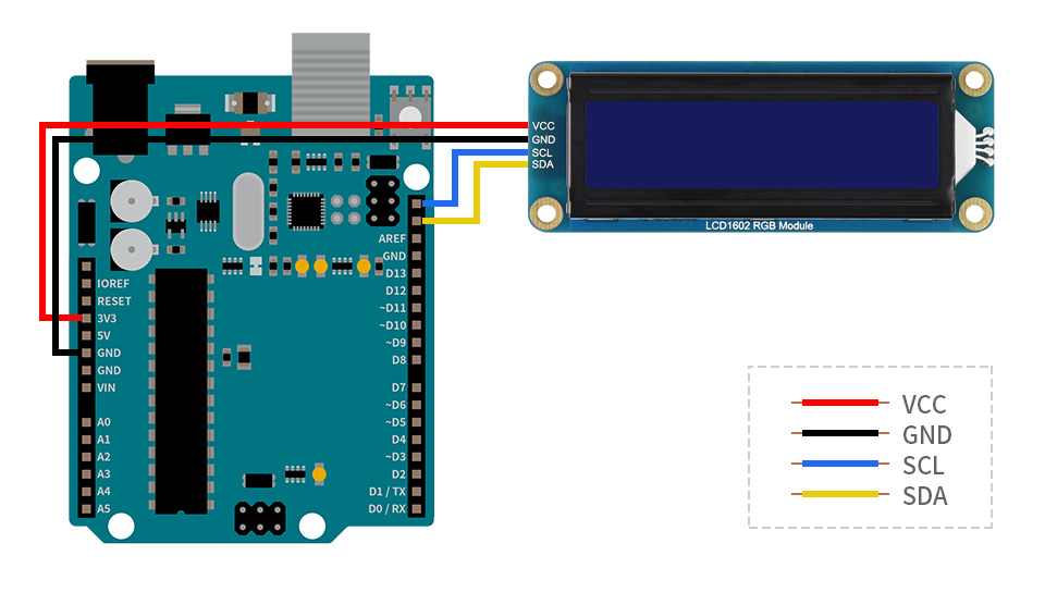 Символьный дисплей построен на базе ЖК дисплея типа STN (Super Twisted Nematic) под управлением контроллера HD44780 и имеет синхронный параллельный 8-битный интерфейс подключённый к конвертеру для преобразования параллельного интерфейса дисплея в шину I2C по которой он и подключается к Arduino.