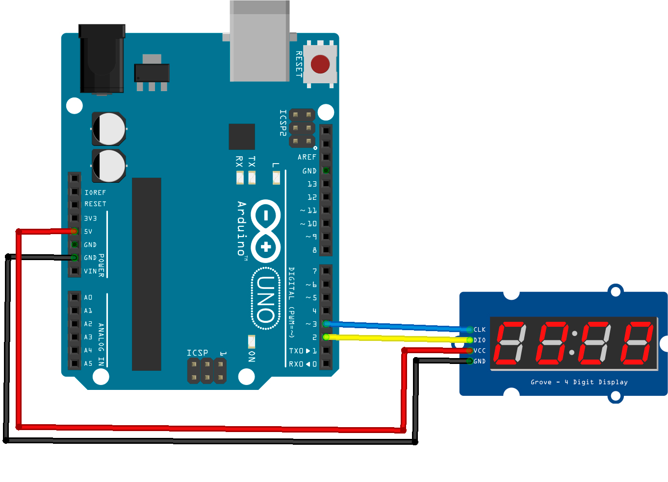 Благодаря наличию i2c интерфейса на борту, подключается модуль очень просто – с помощью четырех контактов. Два из них отвечают за питание и подключаются к выводам 5V и Gnd на панели Power нашего контроллера; два других, называются они CLK и DIO, подключатся к цифровым выводам, например 3 и 2, соответственно.