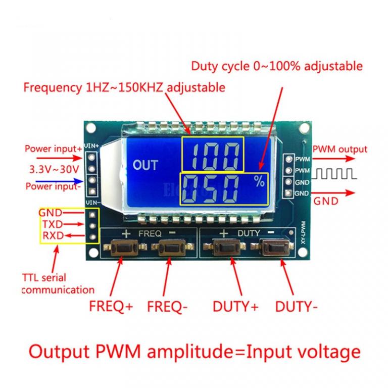 Цифровой одноканальный PWM / ШИМ генератор прямоугольных импульсов с регулируемой частотой и скважностью. Диапазон выходных частот - от 1Гц до 150кГц. Модуль можно использовать в качестве генератора импульсов для различных применений, в том числе для управления драйверами шаговых двигателей, при тестировании оборудования и электронных компонентов, в схемах регулировки мощности и т.д.