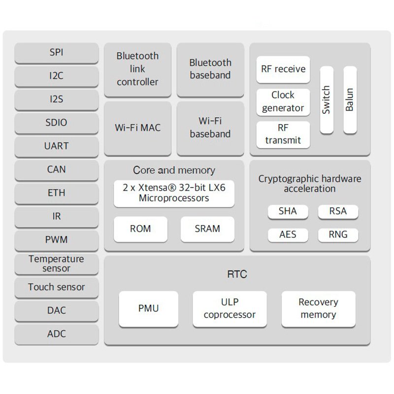 Контроллер имеет два ядра на основе Xtensa LX6 32-бит процессоров (частота от 160 до 240МГц, максимальная производительность до 600 DMIPS)