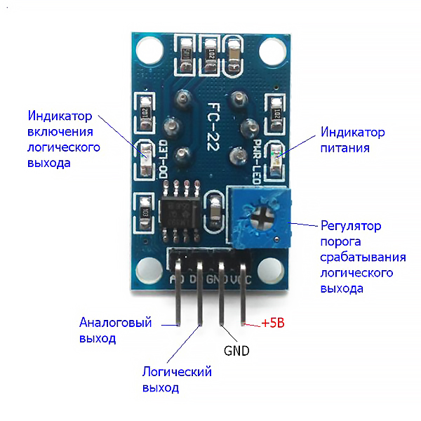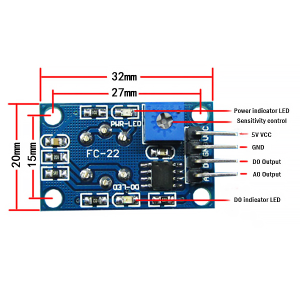 Модуль с датчиком газа MQ серии. Данный модуль имеет аналоговый и пороговый цифровой выходы. Аналоговый сигнал пропорционален концентрации газов, к которым чувствителен датчик. Чувствительность модуля (уровень порога срабатывания цифрового выхода) настраивается подстроечным резистором.