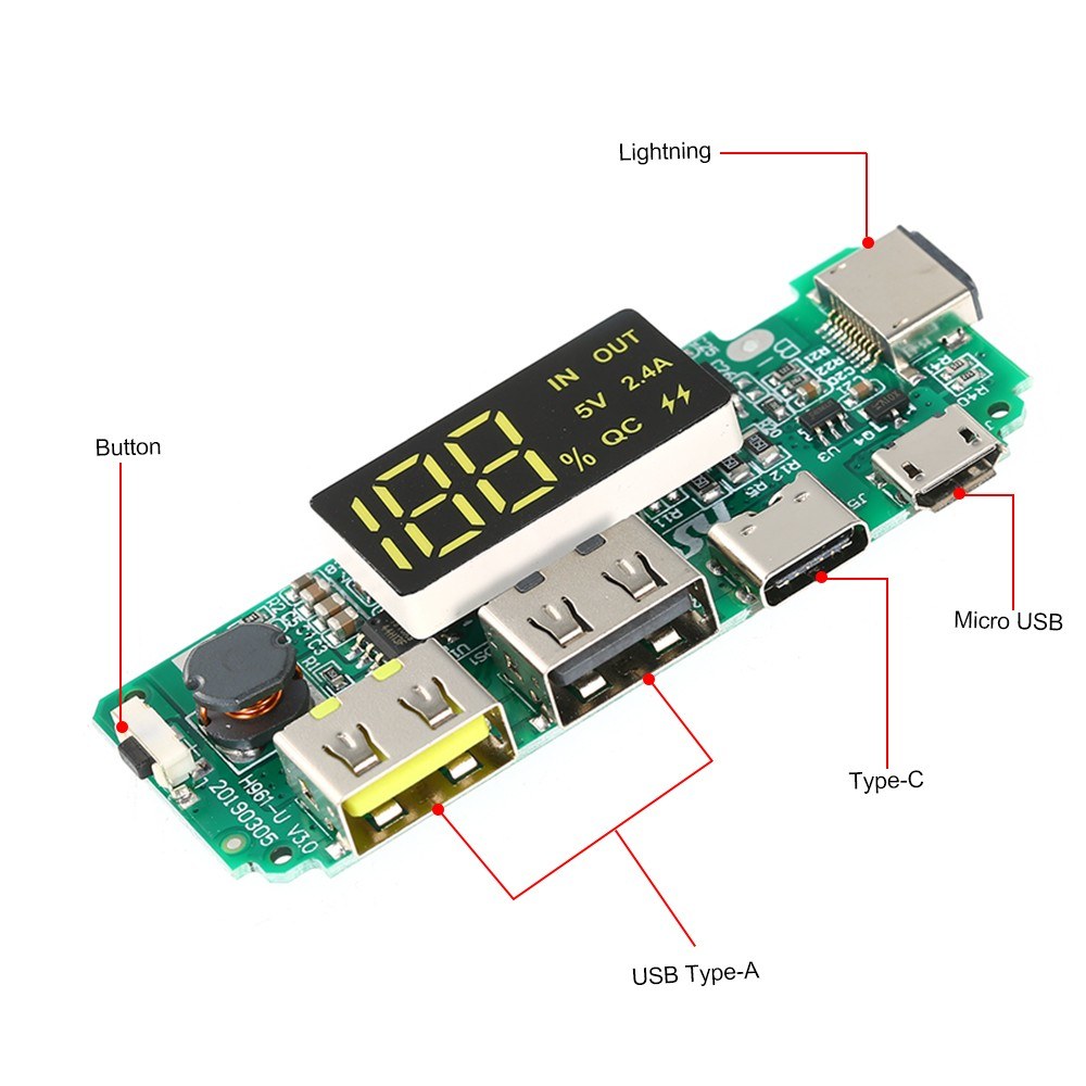 Это плата электроники для мобильного зарядного устройства, содержащая преобразователи для двух выходов 5В с максимальным током 2 * 2,4 А, схему зарядки от Micro/Type-C/Lightning USB 5В, встроенный LED-индикатор для отображения процента зарядки.