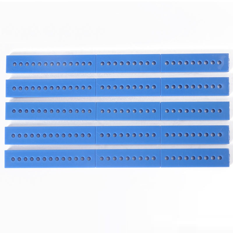 Прочная пластиковая пластина синего цвета с одним рядом отверстий.