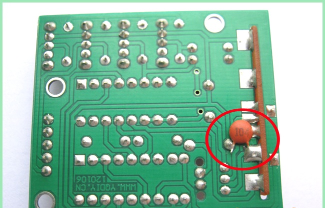 Внимание: для корректной работы изделия, необходимо припаять не обозначенный на плате, но имеющийся в комплекте конденсатор, как указано на изображении набора рис. 2